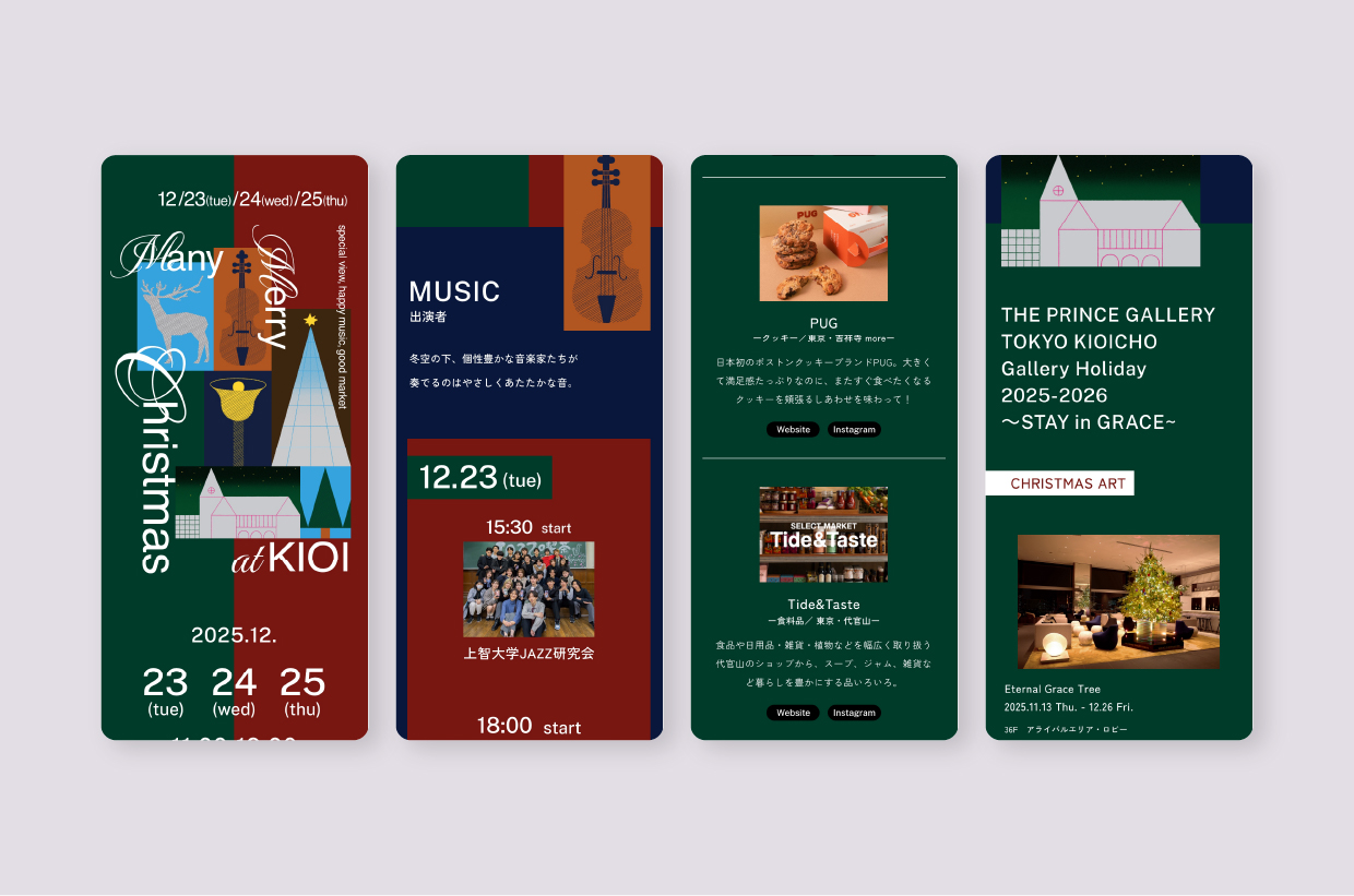 We designed the website for a Christmas event featuring illuminations, live music, and a holiday market. Inspired by the playful tone of the title Many Messy Christmas, we created a lively yet slightly sophisticated visual direction, using illustrations by Hikari Shimamura and dynamic typography to express the festive excitement of the season.